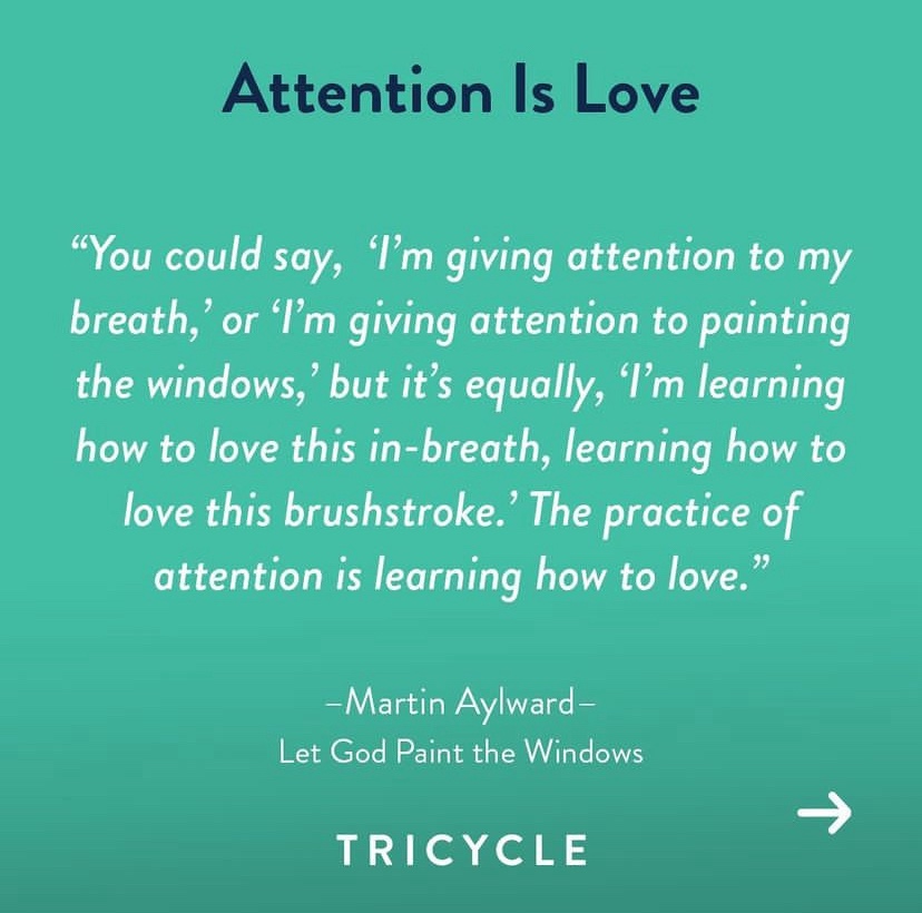 «Внимание — это любовь. Вы можете сказать: «Я уделяю внимание своему дыханию» или «Я уделяю внимание покраске окон», но в равной степени это означает: «Я учусь любить этот вдох, учусь любить этот мазок кисти». Практика внимания — это обучение тому, как любить».